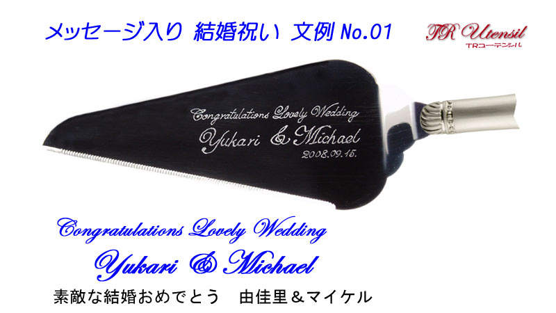 ご注文の際には文例を参考にされましてお客様独自のオリジナルメッセージをお知らせください。 もちろんサムネイル画像をクリックしていただければ、各プレゼント品のメッセージの様子を写真にて確認していただけます。名入れのご注文はケーキサーバーのページよりバスケットをご利用になられると、最後に伝言欄が現れますのでそこからご指定くださるか、あるいはメールフォームにて直接メッセージをお送りくだい。